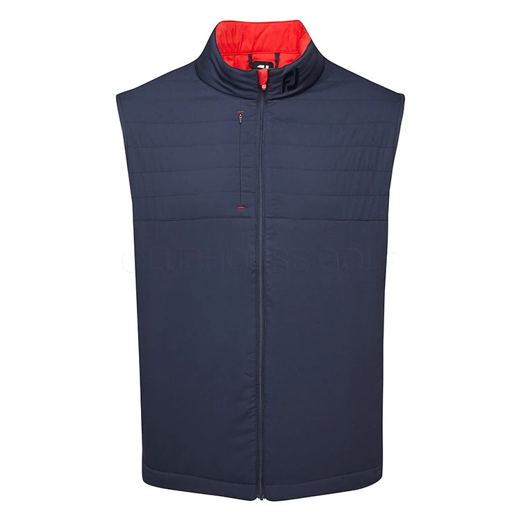 | FootJoy FJ Hybrid Golf Wind Vest Thermal Insulation With Padded Quilted Design The FootJoy FJ Hybrid Wind Vest is the perfect garment for those cold windy days on the course with 100% windproof protection and added thermal insulating design. Made from 100% polyester, the FJ Hybrid Wind Vest is the ideal garment for cold, windy days when extra warmth is needed. It can also be worn in light rain showers and offers light shower proof protection along with the highly insulating design that retains body heat. The woven panel overlay helps trap body heat to retain your core temperature even on the coldest of days. The FJ Hybrid Wind Vest has a quilted design with zip contrast detail and the FJ brand logo on the left collar for added style. With 2 side pockets and full zip design, this thermal wind garment offers exceptional performance with a premium look. |